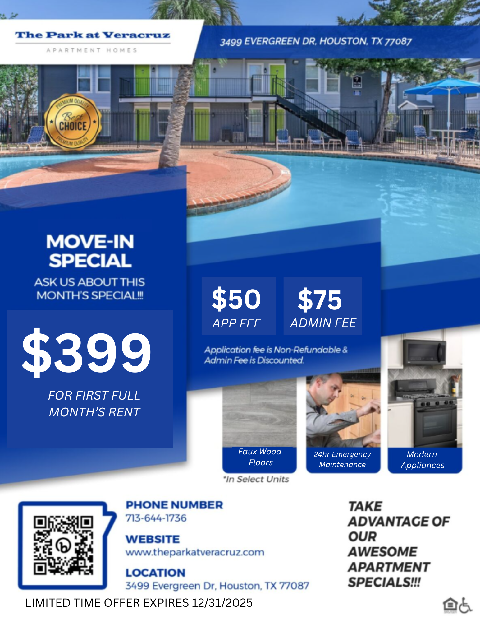 Conveniently located near Interstates 610 and 45, The Park at Veracruz is your gateway to fun and excitement. Being just minutes away from the heart of Houston, Texas, makes your daily commute and exploring the city simple. Our pet-friendly community is surrounded by incredible restaurants, invigorating gyms, enthralling entertainment attractions, and tempting shops to discover. Come and find out why our community is the best in Houston!