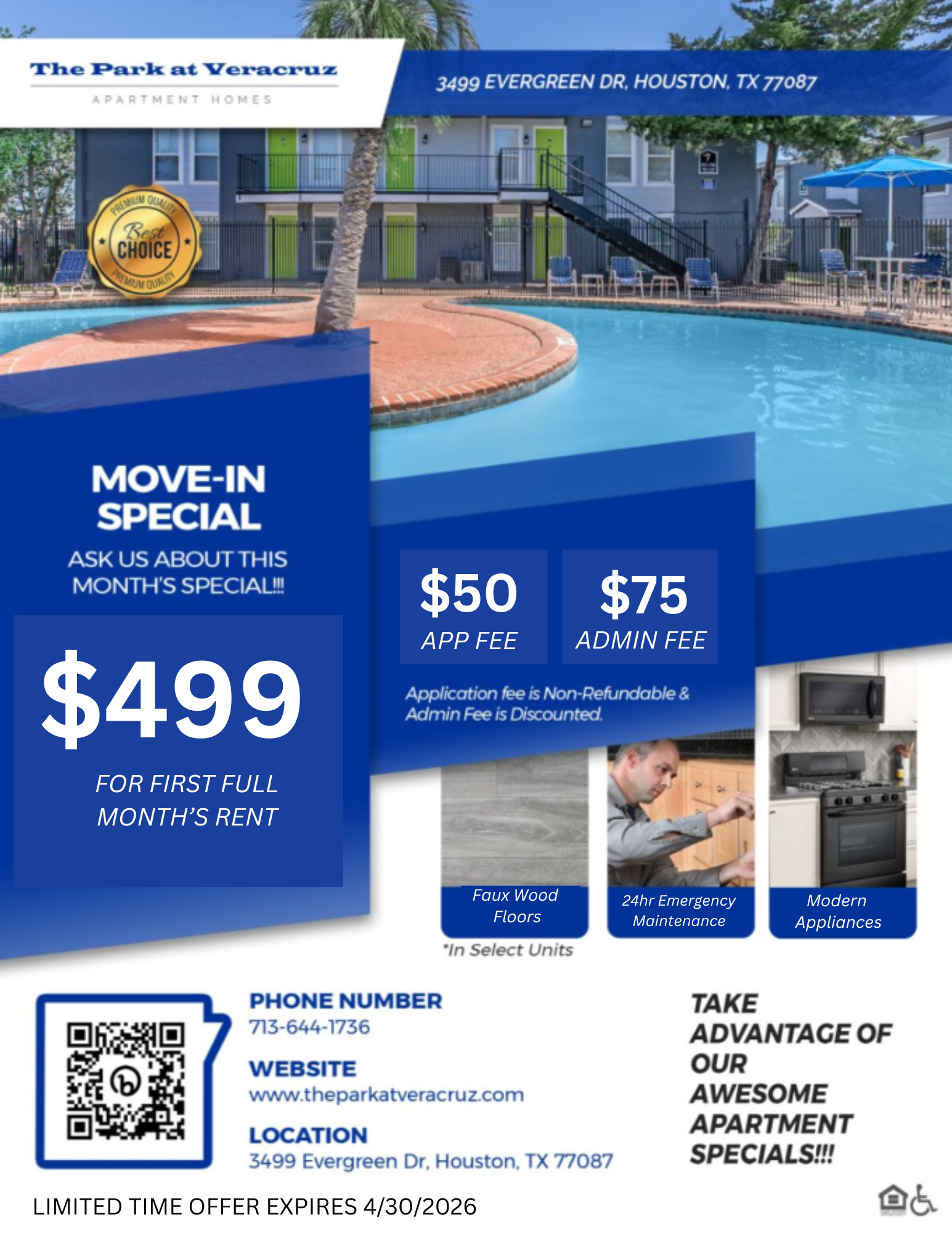 Spring is in full bloom! 🌷 Move into your new home this April and take advantage of our limited-time move-in specials. FIRST FULL MONTH'S RENT IS JUST $499 Fresh season, fresh start, fresh savings — don’t miss your chance to make your move! 🌼